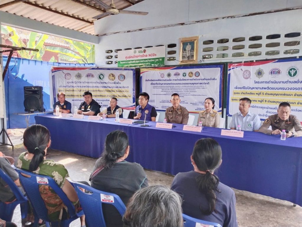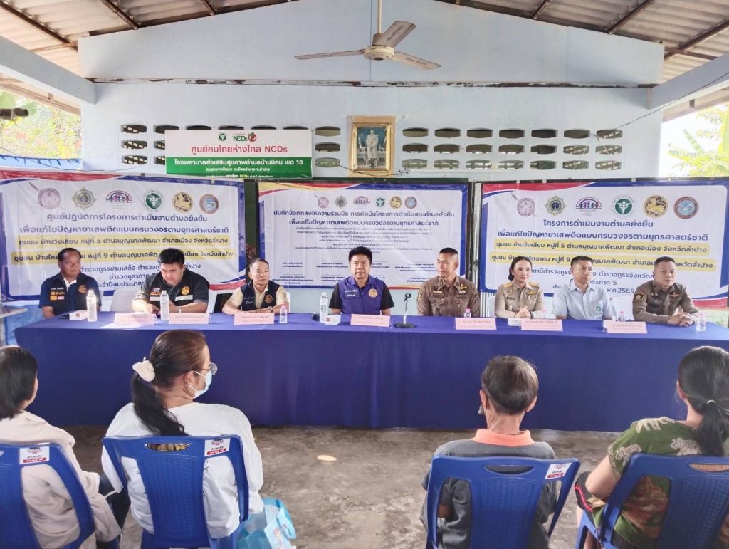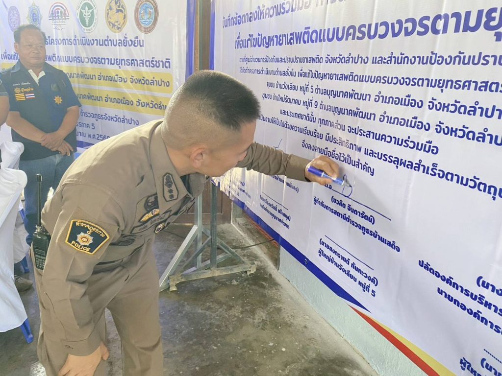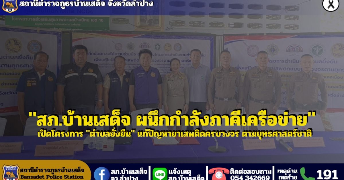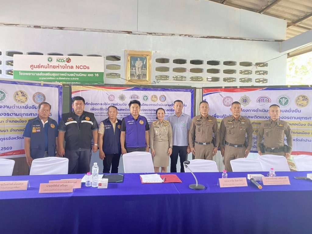 วันนี้ 9 ก.พ.2569 เวลา 09.00 น. พ.ต.อ.ชวลิต จินดารัตน์ ผกก.สภ.บ้านเสด็จ, พ.ต.ท.พงษ์ศิลป์ ธนะภาษี รอง ผกก.ป.ฯ,พ.ต.ต.นพ พึ่งศรี สวป.ฯ,พร้อมด้วยเจ้าหน้าที่ตำรวจชุดปฏิบัติการโครงการดำเนินงานตำบลยั่งยืน ร่วมกับอำเภอเมืองลำปาง,อบต.บุญนาคพัฒนา,รพ.สต.บ้านนิคม เขต 16, กำนันตำบลบุญนาคพัฒนา,ผู้ใหญ่บ้าน ม.5 และ ม.9 ต.บุญนาคพัฒนา อ.เมือง จ.ลำปาง, คณะกรรมการหมู่บ้าน, อสม., ภาคีเครือข่าย ทำการเปิดโครงการดำเนินงานตำบลยั่งยืน เพื่อแก้ไขปัญหายาเสพติดแบบครบวงจรตามยุทธศาสตร์ชาติ ณ ศาลาอเนกประสงค์บ้านวังเลียบ ม.5 ต.บุญนาคพัฒนา อ.เมือง จว.ลำปาง โดยมี นายสุทธิพันธ์ เครือสุข ปลัดอำเภอเมืองลำปาง เป็นประธานในพิธีเปิดโครงการฯ ซึ่งทุกฝ่ายให้ได้เห็นพ้องกันว่าปัญหายาเสพติดเป็นปัญหาสำคัญเร่งด่วนที่จะต้องได้รับการแก้ไขโดยมีการบูรณาการร่วมกัน เพื่อแก้ไขปัญหาดังกล่าวอย่างครบวงจร จึงได้ร่วมลงนาม MOU ไว้เป็นสำคัญ