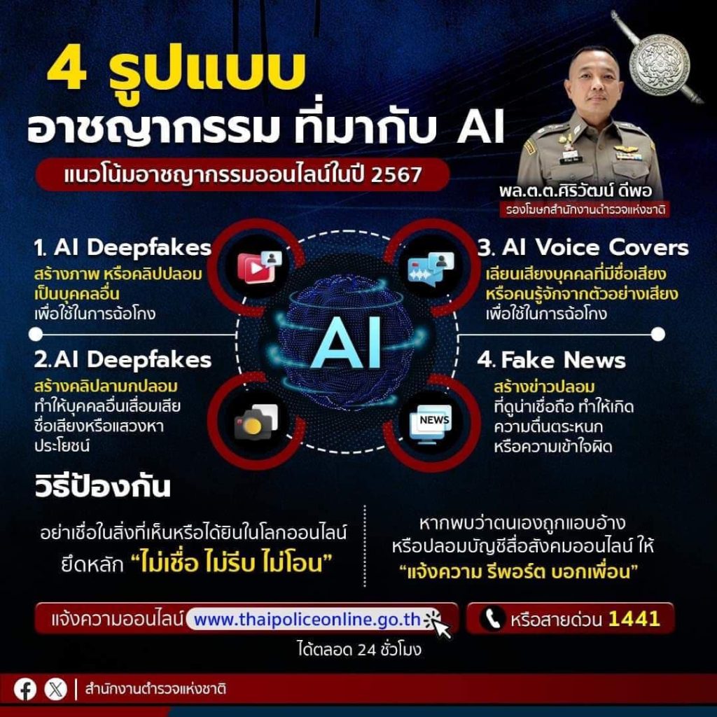 ส่วนแนวโน้มรูปแบบของอาชญากรรมออนไลน์ในปี พ.ศ. 2567 ที่จะมาถึงนี้ สิ่งที่พี่น้องประชาชนต้องระมัดระวังนอกเหนือจากที่ได้กล่าวมาข้างต้น คือการที่คนร้ายนำเทคโนโลยีปัญญาประดิษฐ์ (Artificial Intelligence หรือ AI) มาใช้ในการสร้างเนื้อหาปลอมขึ้นมาเพื่อใช้ในการฉ้อโกง หรือสร้างความเสียหาย โดยการนำ AI มาใช้สร้างภาพหรือคลิปปลอม เพื่อนำมาแสวงหาประโยชน์ต่าง ๆ เช่น