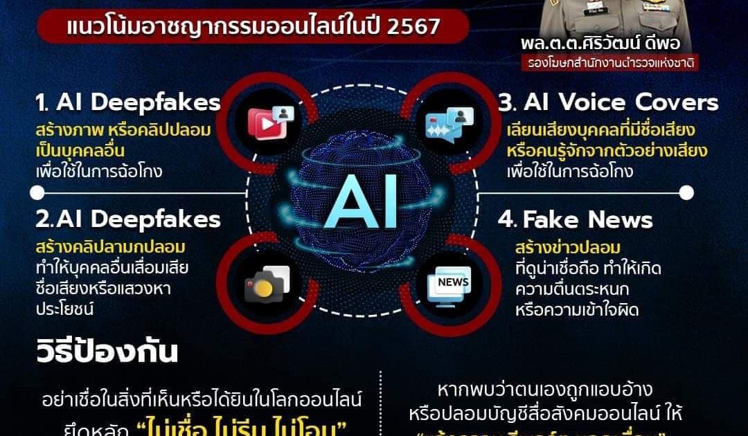 ส่วนแนวโน้มรูปแบบของอาชญากรรมออนไลน์ในปี พ.ศ. 2567 ที่จะมาถึงนี้ สิ่งที่พี่น้องประชาชนต้องระมัดระวังนอกเหนือจากที่ได้กล่าวมาข้างต้น คือการที่คนร้ายนำเทคโนโลยีปัญญาประดิษฐ์ (Artificial Intelligence หรือ AI) มาใช้ในการสร้างเนื้อหาปลอมขึ้นมาเพื่อใช้ในการฉ้อโกง หรือสร้างความเสียหาย โดยการนำ AI มาใช้สร้างภาพหรือคลิปปลอม เพื่อนำมาแสวงหาประโยชน์ต่าง ๆ เช่น