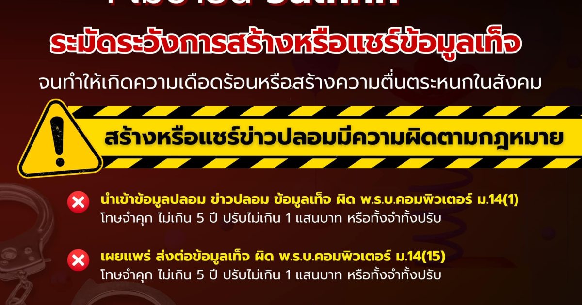 โปรดระมัดระวังการสร้างเรื่อง หรือแชร์ข้อมูลเท็จ จนทำให้เกิดความเดือดร้อนหรือสร้างความตื่นตระหนกในสังคมมีความผิดตามกฎหมาย