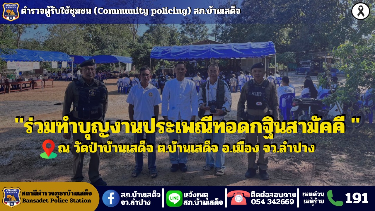 ตำรวจผู้รับใช้ชุมชน (Community policing) สภ.บ้านเสด็จ วันที่ 22 พฤศจิกายน 2568 ตั้งแต่เวลา 10.00 น. นำโดย พ.ต.อ.ชวลิต จินดารัตน์ผกก.สภ.บ้านเสด็จ , ร.ต.ท.วิรัช วงค์บุตร รอง สว.(ป.) สภ.บ้านเสด็จ ร้อยเวร 20 พร้อมสายตรวจ 201 ร่วมทำบุญงานประเพณีทอดกฐินสามัคคี ที่วัดป่าบ้านเสด็จ ต.บ้านเสด็จ อ.เมือง จว.ลำปาง และ สอบถามสภาพปัญหาอาชญากรรมและปัญหาต่างๆ ในพื้นที่ เพื่อขอคำแนะนำและช่วยกันแก้ไขปัญหาความเป็นอยู่ของคนในชุมชน