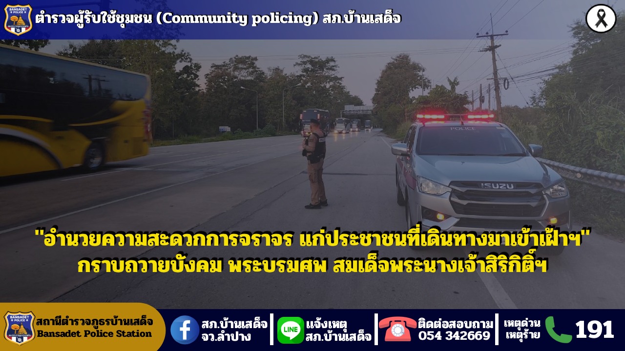 ตำรวจผู้รับใช้ชุมชน (Community policing) สภ.บ้านเสด็จ วันที่ 25 พฤศจิกายน 2568 เวลา 17.40 น. โดยการอำนวยการสั่งการของ พ.ต.อ.ชวลิต จินดารัตน์ ผกก.สภ.บ้านเสด็จ , พ.ต.ท. พงษ์ศิลป์ ธนะภาษี รองผกก.ป.ฯ, พ.ต.ท.กำจร ใจจันทร์ สวป.ฯมอบหมายให้ ร.ต.ท.วิรัช วงค์บุตร รอง สว.(ป.) สภ.บ้านเสด็จ ร้อยเวร 20 พร้อมสายตรวจ 201 ว.4 อำนวยความสะดวกการจราจร แก่ประชาชนที่เดินทางมาเข้าเฝ้าฯกราบถวายบังคม พระบรมศพ สมเด็จพระนางเจ้าสิริกิติ์ฯ ที่บริเวณแยกไฟแดงปากทางเขื่อนกิ่วลม ม.16 ต.บ้านเสด็จ อ.เมือง จ.ลำปาง