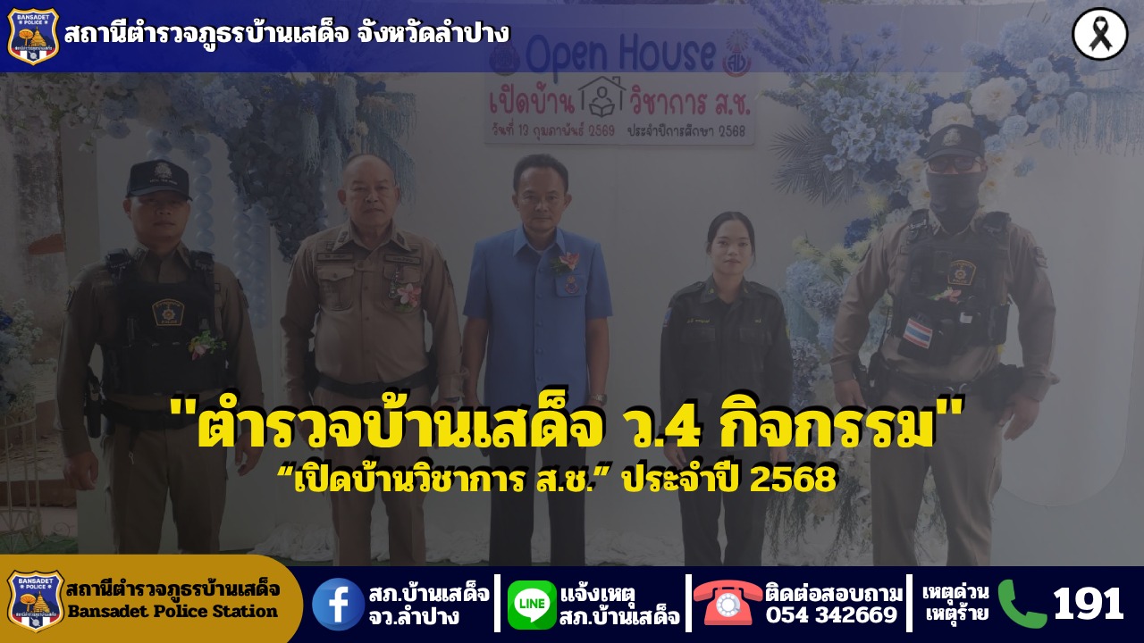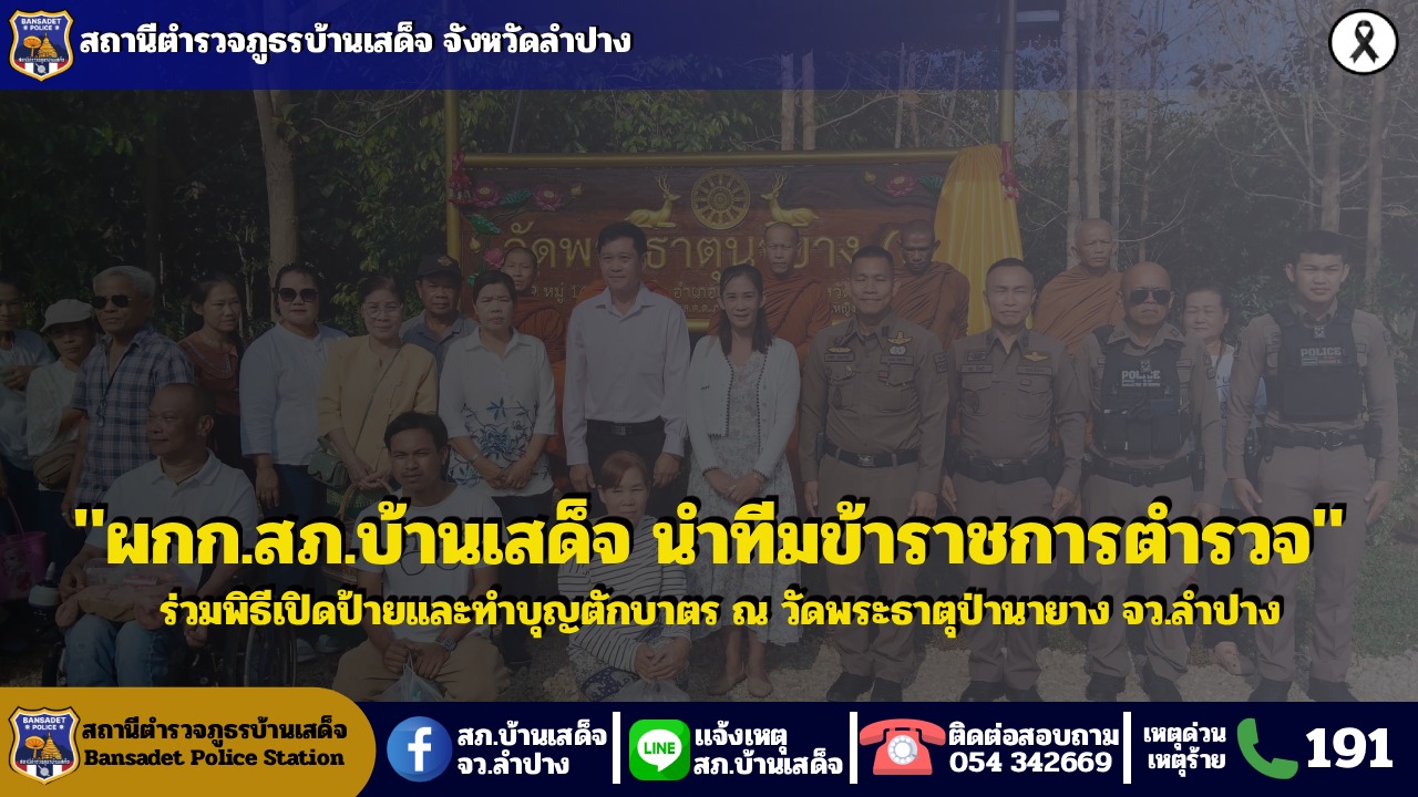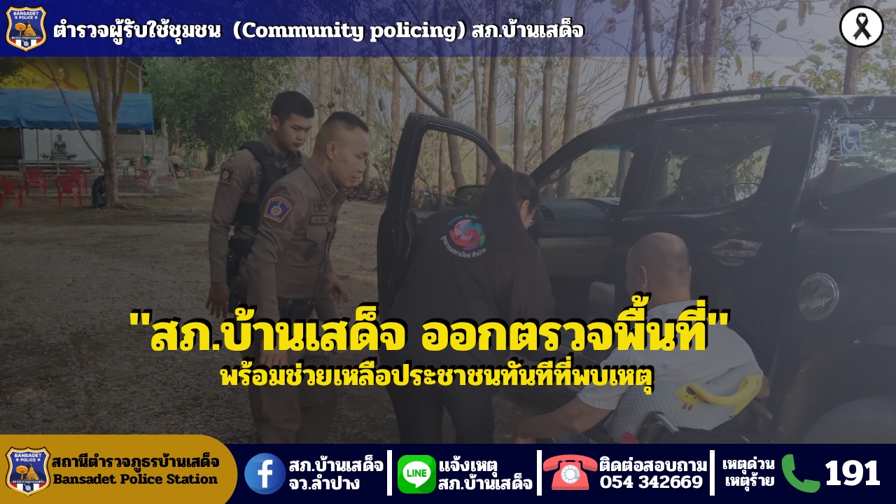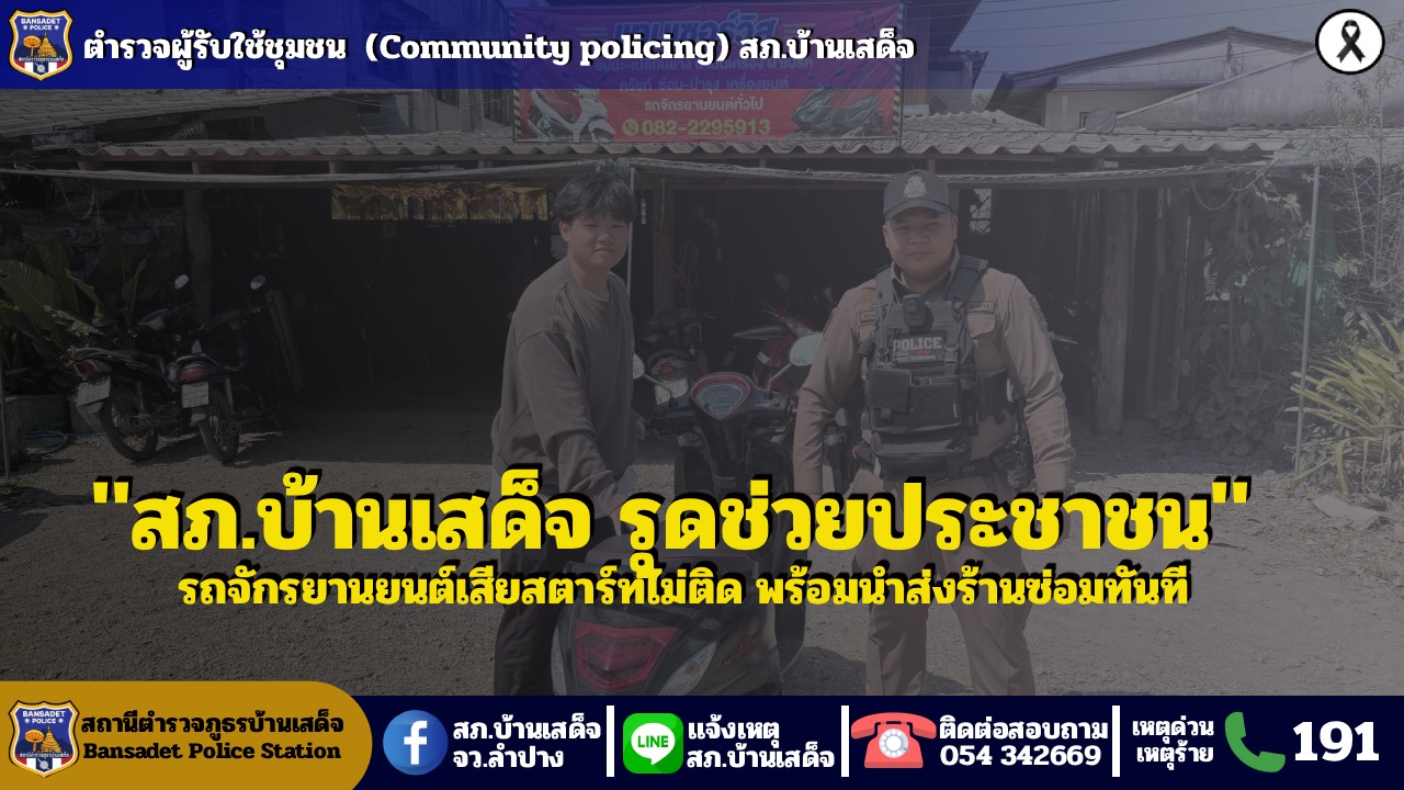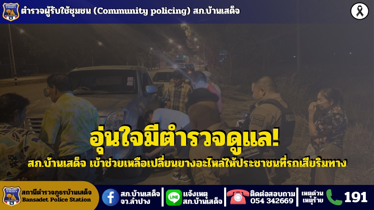 ตำรวจผู้รับใช้ชุมชน(Community policing) สภ.บ้านเสด็จ วันที่ 18 กุมภาพันธ์ 2569 เวลา 19.10 น.ได้รับแจ้งทางศูนย์วิทยุสภ.บ้านเสด็จ ว่ามีประชาชนขอความช่วยเหลือรถยนต์ยางแตก ที่ถนนสายลำปาง – งาว เขตพื้นที่บ้านทรายทอง ม.3 ต.บ้านเสด็จ อ.เมืองลำปาง จ.ลำปาง ด.ต.ชาติ บุญสมปาน ผบ.หมู่ (ป.)ฯ รักษาการร้อยเวร 20 พร้อมสายตรวจ 201 ว.4 ที่เกิดเหตุ ได้ช่วยเหลือประชาชนเปลี่ยนยางอะไหล่เป็นที่เรียบร้อย