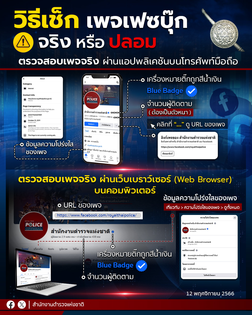 สำนักงานตำรวจแห่งชาติแนะนำเทคนิคการดูเพจเฟซบุ๊กปลอม หลอกขายของออนไลน์ สร้างยอดติดตามเกินจริง เมื่อวันที่ 12 พฤศจิกายน 2566 พ.ต.อ.ศิริวัฒน์ ดีพอ รองโฆษกสำนักงานตำรวจแห่งชาติ กล่าวว่า พล.ต.อ.ต่อศักดิ์ สุขวิมล ผบ.ตร. ได้มีความห่วงใยพี่น้องประชาชนที่อาจได้รับความเสียหายจากอาชญากรรมรูปแบบต่าง ๆ ซึ่งในปัจจุบันมีพี่น้องประชาชนจำนวนมากที่ได้รับความเสียหายจากการหลอกลวงบนสื่อสังคมออนไลน์ ซึ่งการหลอกลวงรูปแบบหนึ่งที่พบมากที่สุด และมีจำนวนผู้ได้รับความเสียหายมากที่สุด ก็คือการหลอกขายของออนไลน์ หรือซื้อของไม่ได้ของ โดยจากสถิติการรับแจ้งความออนไลน์ของสำนักงานตำรวจแห่งชาติ ตั้งแต่เดือนมีนาคม 2565 จนถึงปัจจุบัน พบว่ามีผู้เสียหายจำนวนกว่า 140,000 ราย มูลค่าความเสียหายกว่า 2,000 ล้านบาท ซึ่งบัญชีเฟซบุ๊กปลอมถือเป็นเครื่องมือสำคัญที่คนร้ายมักจะใช้ในการกระทำความผิด สำนักงานตำรวจแห่งชาติจึงขอแนะนำเทคนิคในการตรวจสอบเพจเฟซบุ๊กปลอม หลอกขายของออนไลน์ ที่คนร้ายจะสร้างความน่าเชื่อถือโดยการเลียนแบบเพจที่มีอยู่จริง นำภาพ หรือข้อความของเพจต่าง ๆ มาใช้ และมีการสร้างเลขจำนวนผู้ติดตามปลอมเพื่อหลอกผู้เสียหาย โดยสำนักงานตำรวจแห่งชาติขอแนะนำเทคนิคในการตรวจสอบว่าเพจใดเป็นเพจที่แท้จริง ดังนี้ 1. การตรวจสอบจำนวนผู้ติดตามที่แท้จริง : หากเป็นเพจจริง มักจะมียอดผู้ติดตาม เป็นจำนวนมาก ส่วนเพจปลอมมักจะมีการเขียนจำนวนผู้ติดตามขึ้นเองให้เท่ากับเพจจริง โดยหากใช้เฟซบุ๊กผ่านแอปพลิเคชันบนโทรศัพท์มือถือ จะสามารถตรวจสอบจำนวนผู้ติดตามได้บนหน้าเพจ จำนวนผู้ติดตามที่แท้จริงจะต้องเป็นตัวหน้าสีดำเข้มเท่านั้น และอยู่ติดกับชื่อเพจ , หากใช้เฟซบุ๊กผ่านเว็บเบราว์เซอร์ (Web Browser) บนคอมพิวเตอร์ จะสามารถตรวจสอบจำนวนผู้ติดตามได้บนหน้าเพจ โดยจำนวนผู้ติดตามที่แท้จริงจะอยู่ติดกับชื่อเพจเท่านั้น อย่าเชื่อจำนวนผู้ติดตามที่ปรากฏในหน้าการค้นหา เพราะจะตรวจสอบได้ยากว่าเป็นจำนวนผู้ติดตามจริงหรือไม่ หรือเป็นเพียงคำอธิบายที่คนร้ายเขียนขึ้นเอง 2. การตรวจสอบข้อมูลพื้นฐานของเพจ : ดูจากชื่อของเพจ วันที่สร้างเพจ และ URL ของเพจ โดยหากใช้เฟซบุ๊กผ่านแอปพลิเคชันบนโทรศัพท์มือถือ จะสามารถตรวจสอบได้โดยการเข้าไปที่หน้าเพจ จากนั้นกดที่สัญลักษณ์ จุดสามจุด “…” ใต้ชื่อเพจ และเมนูดูข้อมูล “เกี่ยวกับ” , หากใช้เฟซบุ๊กผ่านเว็บเบราว์เซอร์ (Web Browser) บนคอมพิวเตอร์ จะสามารถตรวจสอบ URL ได้ที่ Address Bar ด้านบน ส่วนข้อมูลพื้นฐานอื่น ๆ จะต้องเข้าไปที่ “เกี่ยวกับ>ความโปร่งใสของ