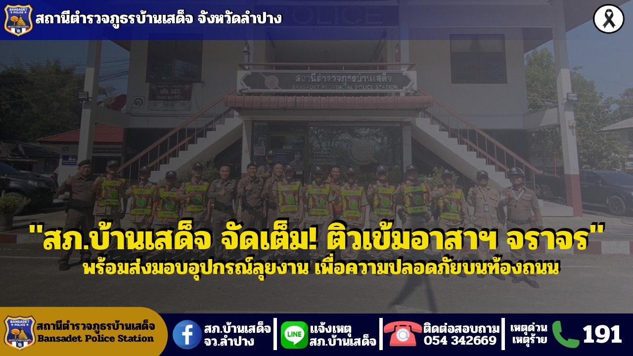 สภ.บ้านเสด็จ จว.ลำปาง วันที่ 28 มกราคม 2569 ตั้งแต่เวลา 10.00 น. นำโดย พ.ต.อ.ชวลิต จินดารัตน์ ผกก.สภ.บ้านเสด็จ, พ.ต.ท.พงษ์ศิลป์ ธนะภาษี รอง ผกก.ป.ฯ , ว่าที่ พ.ต.ต.นพ พึ่งศรี สวป.ฯ, ร้อยเวร 20 พร้อมสายตรวจ 201 และ เจ้าหน้าที่จราจร ว.4 จัดโครงการอบรมให้ความรู้เกี่ยวกับการอำนวยความสะดวกการจราจรบนท้องถนนให้กับอาสาสมัครตำรวจบ้านในเขตพื้นที่รับผิดชอบ พร้อมกับมอบเสื้อสะท้อนแสงให้ทุกท่าน เพื่อใช้ในการปฏิบัติหน้าที่ ณ สถานีตำรวจภูธรบ้านเสด็จ ต.บ้านเสด็จ อ.เมือง จ.ลำปาง