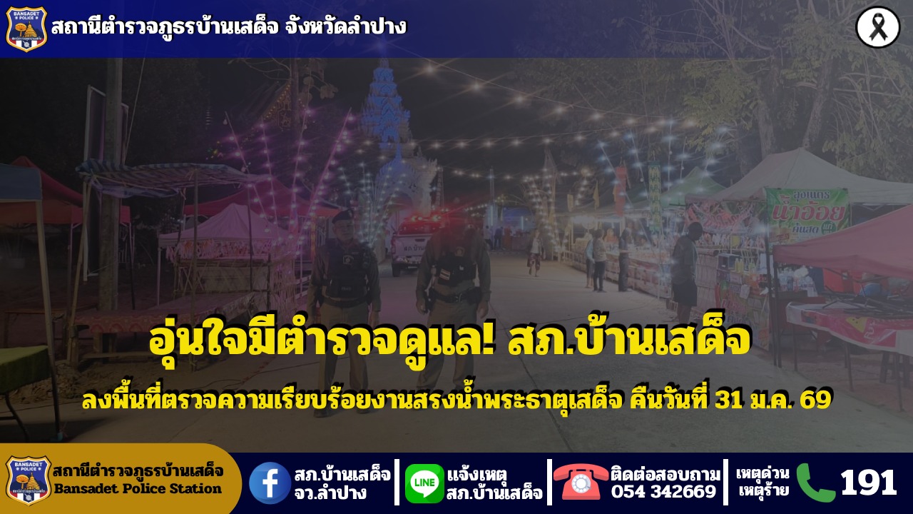 สภ.บ้านเสด็จ จว.ลำปาง วันนี้ 31 มกราคม 2569 เวลา 20.00 น. โดยการอำนวยการของ พ.ต.อ.ชวลิต จินดารัตน์ ผกก.สภ.บ้านเสด็จ , พ.ต.ท.พงษ์ศิลป์ ธนะภาษี รอง ผกก.ป.ฯ , ว่าที่ พ.ต.ต.นพ พึ่งศรี สวป.ฯ สั่งการให้ ร.ต.ท.วิรัช วงค์บุตร รอง สว.(ป.) สภ.บ้านเสด็จ ร้อยเวร 20 พร้อมสายตรวจ 201 ว.4 ออกตรวจจุดเสี่ยง จุดล่อแหลม เปิดสัญญาณไฟวับวาบเพื่อป้องกันเหตุอาชญากรรม ที่งานสรงน้ำพระวัดพระธาตุเสด็จ ม.5 ต.บ้านเสด็จ อ.เมืองลำปาง จ.ลำปาง