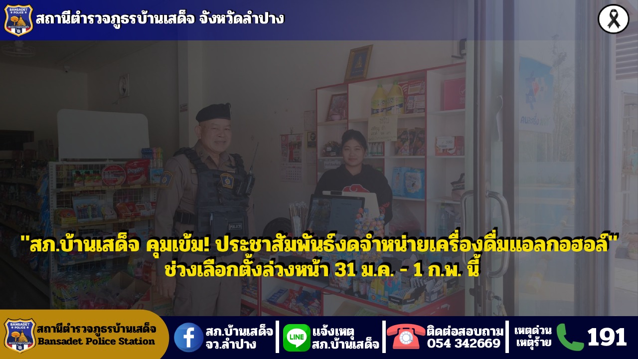 สภ.บ้านเสด็จ จว.ลำปาง วันนี้ 31 มกราคม 2569 เวลา 10.00 น. โดยการสั่งการของ พ.ต.อ.ชวลิต จินดารัตน์ผกก.สภ.บ้านเสด็จ , พ.ต.ท. พงษ์ศิลป์ ธนะภาษี รองผกก.ป.ฯ,ว่าที่พ.ต.ต.นพ พึ่งศรี สวป.ฯ สั่งการให้ ร.ต.ท.วิรัช วงค์บุตร รอง สว.(ป.) สภ.บ้านเสด็จ ร้อยเวร 20 พร้อมสายตรวจ 201 ว.4 ประชาสัมพันธ์ ห้ามขาย ห้ามจำหน่าย จ่ายแจกเครื่องดื่มแอลกอฮอล์ ในเขตพื้นที่รับผิดชอบ เวลา 18.00 น.ของวันทึ่ 31 ม.ค.69 ถึงเวลา 18.00 น.ของวันที่ 1 ก.พ.69 เนื่องในวันเลือกตั้งล่วงหน้า