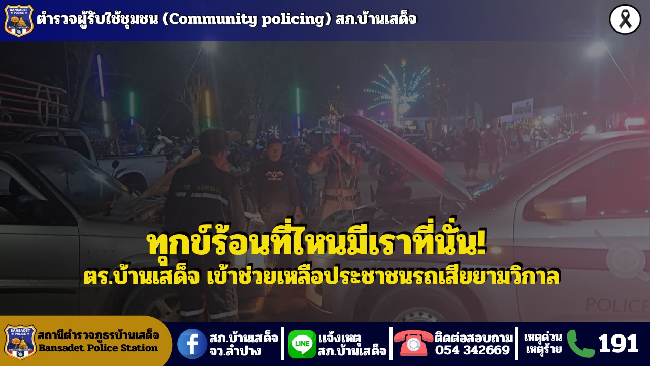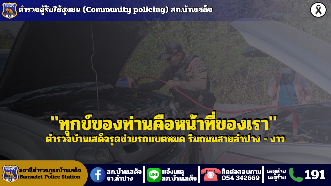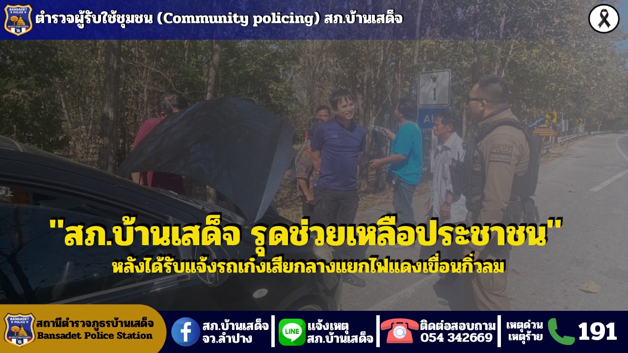 ตำรวจผู้รับใช้ชุมชน ( Community Policing ) สภ.บ้านเสด็จ วันที่ 1 กุมภาพันธ์ 2569 เวลา 11.10 น.ได้รับแจ้งเหตุจากศูนย์วิทยุสภ.บ้านเสด็จ ว่ามีเหตุ รถยนต์แบตหมดสตาร์ทไม่ติดบริเวณถนนเส้นลำปาง – งาว (หลักกิโลเมตรที่733-734 ขาขึ้น) ม.15 บ.ห้วยหลวง ต.บัานเสด็จ ร.ต.ท.วิรัช วงค์บุตร รอง สว.(ป.) สภ.บ้านเสด็จ ร้อยเวร 20 พร้อมสายตรวจ 201 ว.4 เบื้องต้นได้ดำเนินการช่วยเหลือเป็นที่เรียบร้อย