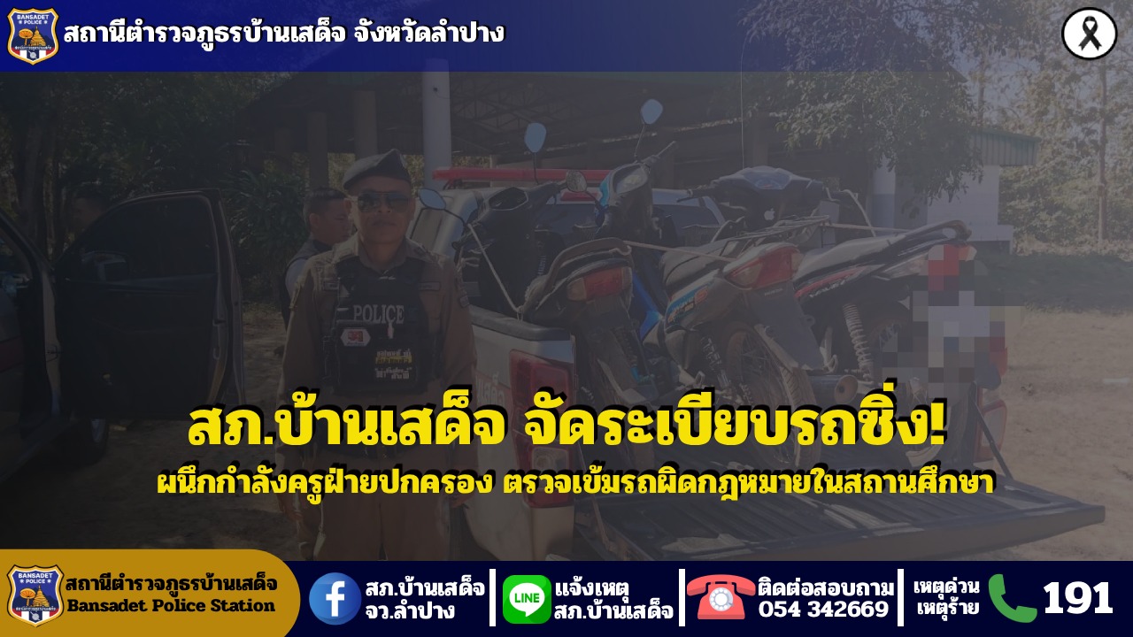 สภ.บ้านเสด็จ จว.ลำปาง วันที่ 3 กุมภาพันธ์ 2569 เวลา 10.00 น. โดยการอำนวยการสั่งการของ พ.ต.อ.ชวลิต จินดารัตน์ ผกก.สภ.บ้านเสด็จ , พ.ต.ท.พงษ์ศิลป์ ธนะภาษี รอง ผกก.ป.ฯ , ว่าที่ พ.ต.ต.นพ พึ่งศรี สวป.ฯ มอบหมายให้ ด.ต.ชาติ บุญสมปาน ผบ.หมู่ (ป.)ฯ รักษาการร้อยเวร 20 พร้อมสายตรวจ 201 ว.4 ดำเนินการตามมาตรการระดมกวาดล้างจับกุมรถที่ผิดกฎหมาย มีการเปลี่ยนแปลงสภาพรถ และกวดขันวินัยจราจรแก่ผู้ขับขี่ที่ไม่ปฏิบัติตามกฎหมาย โดยได้ดำเนินการร่วมกับอาจารย์ฝ่ายปกครองฯ ณ บริเวณโรงจอดรถ โรงเรียนเมืองมายวิทยา ม.9 ต.บ้านแลง อ.เมือง จ.ลำปาง ผลการปฏิบัติได้ตรวจยึดรถผิดกฎหมาย มีการเปลี่ยนแปลงสภาพรถ จำนวน 5 คัน และได้นำส่งพนักงานสอบสวน สภ.บ้านเสด็จ ดำเนินการในส่วนที่เกี่ยวข้องต่อไป