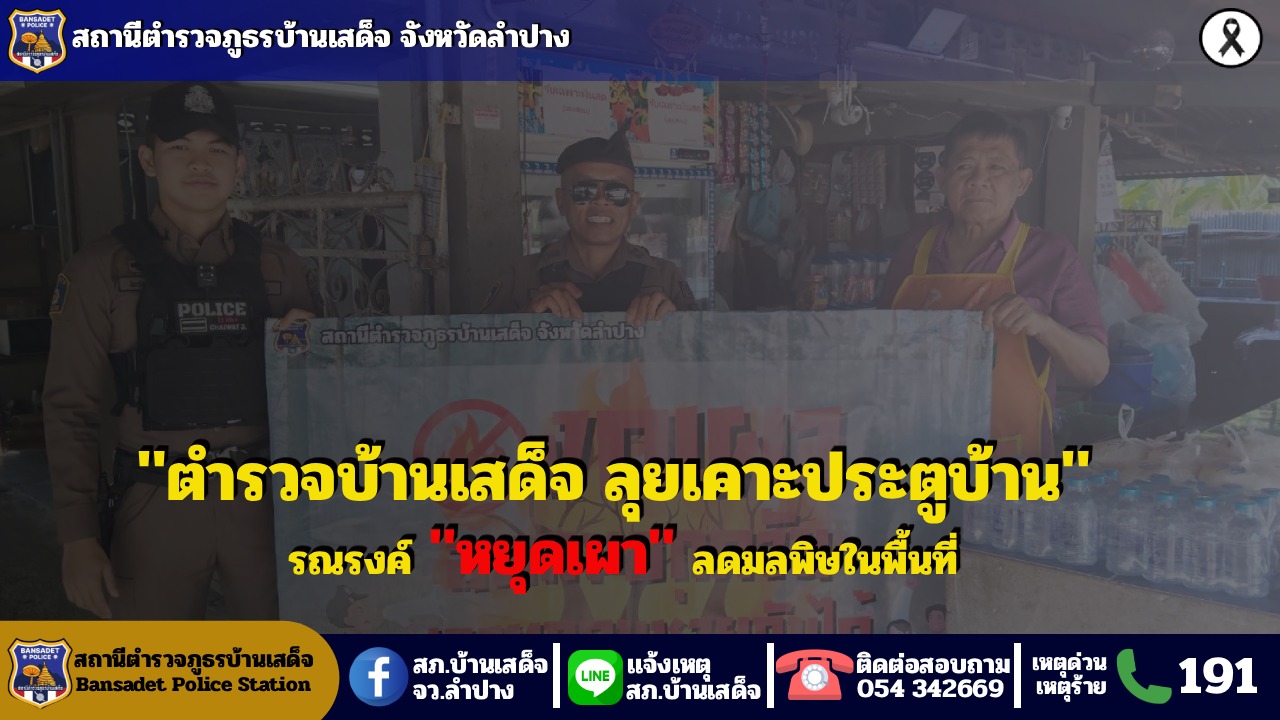 สภ.บ้านเสด็จ จว.ลำปาง วันนี้ 7 กุมภาพันธ์ 2569 เวลา 09.30 น.โดยการสั่งการของ พ.ต.อ.ชวลิต จินดารัตน์ ผกก.สภ.บ้านเสด็จ , พ.ต.ท.พงษ์ศิลป์ ธนะภาษี รอง ผกก.ป.ฯ , ว่าที่ พ.ต.ต.นพ พึ่งศรี สวป.ฯ สั่งการให้ ด.ต.ชาติ บุญสมปาน ผบ.หมู่ (ป.)ฯ รักษาการร้อยเวร 20 พร้อมสายตรวจ 201 ว.4 ประชาสัมพันธ์ในพื้นที่รับผิดชอบ เรื่องการงดเผาหญ้า เผาขยะ และเผาผลผลิตทางการเกษตร ตามนโยบายของรัฐบาล