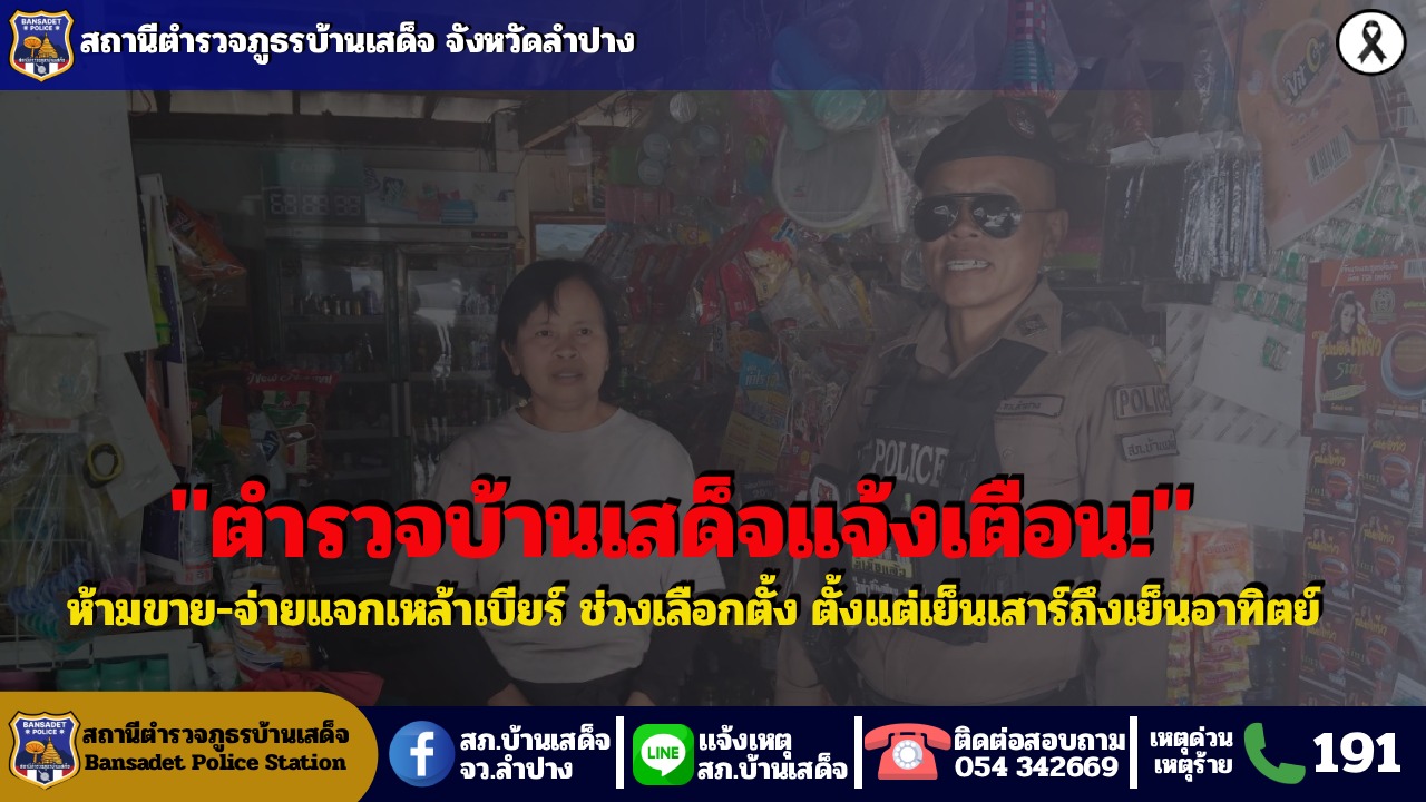 สภ.บ้านเสด็จ จว.ลำปาง วันนี้ 7 กุมภาพันธ์ 2569 โดยการสั่งการของ พ.ต.อ.ชวลิต จินดารัตน์ผกก.สภ.บ้านเสด็จ , พ.ต.ท. พงษ์ศิลป์ ธนะภาษี รอง ผกก.ป.ฯ , ว่าที่ พ.ต.ต.นพ พึ่งศรี สวป.ฯ สั่งการให้ ด.ต.ชาติ บุญสมปาน ผบ.หมู่ (ป.)ฯ รักษาการร้อยเวร 20 พร้อมสายตรวจ 201 ว.4 ประชาสัมพันธ์ ห้ามขาย ห้ามจำหน่าย จ่ายแจกเครื่องดื่มแอลกอฮอล์ ในเขตพื้นที่รับผิดชอบ เวลา 18.00 น.ของวันที่ 7 ก.พ.69 ถึงเวลา 18.00 น.ของวันที่ 8 ก.พ.69 เนื่องในวันเลือกตั้งฯ