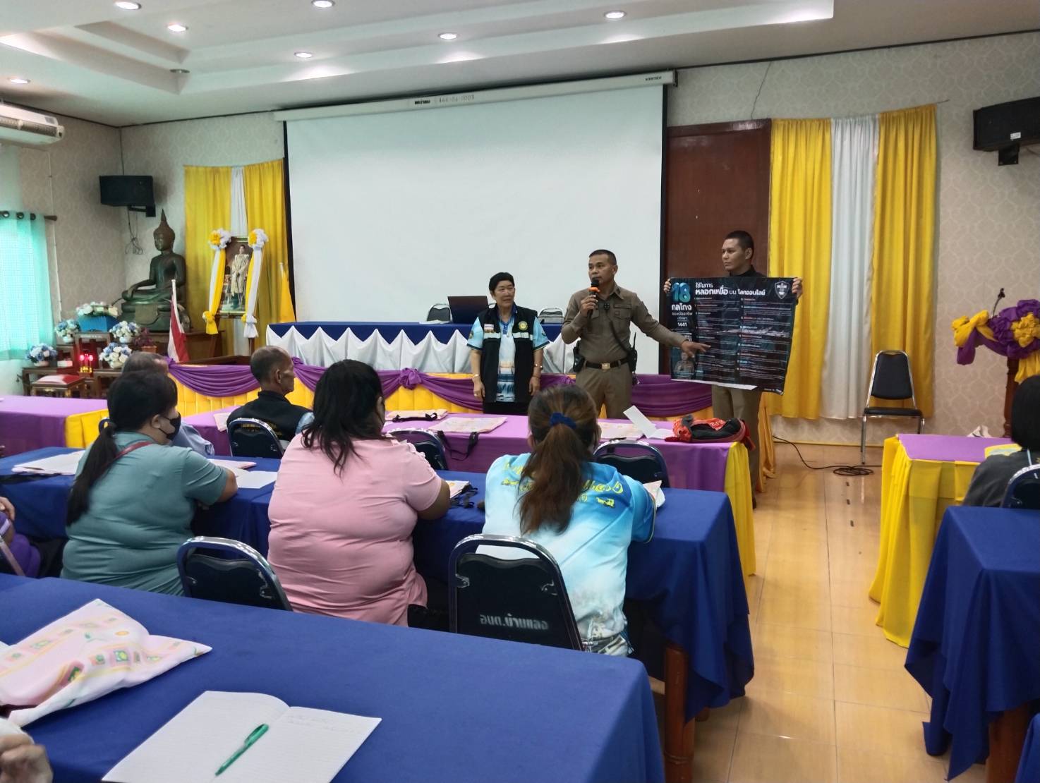 การบรรยายให้ความรู้แก่ครูนักเรียนรร.วัดเสด็จ เรื่องการเอาตัวรอดจากเหตุกราดยิง หลักหนี ซ่อน สู้ และเรื่องการป้องการการถูกฉ้อโกงทางออนไลน์