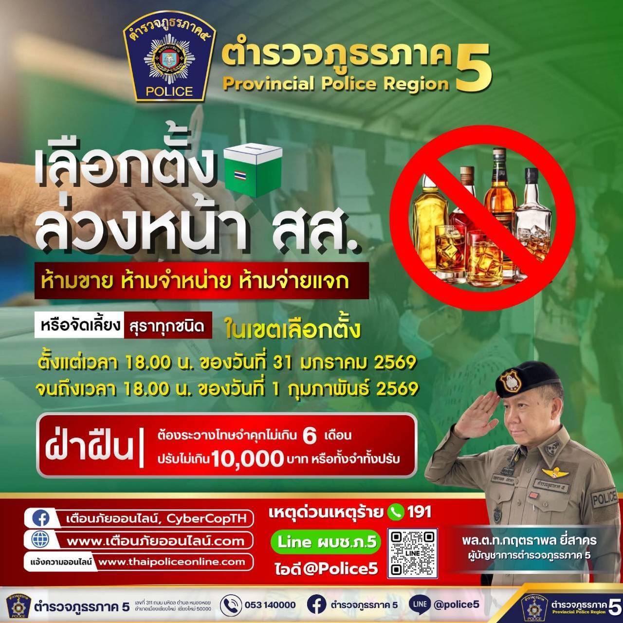 ห้ามขาย จำหน่าย จ่ายแจก จัดเลี้ยงสุราทุกชนิด วันเลือกตั้ง สส.2569 ตั้งแต่ 18.00 น. วันที่ 7 กุมภาพันธ์ 2569ถึง 18.00 น.วันที่ 8 กุมภาพันธ์ 2569ฝ่าฝืนมีความผิดตามกฎหมาย