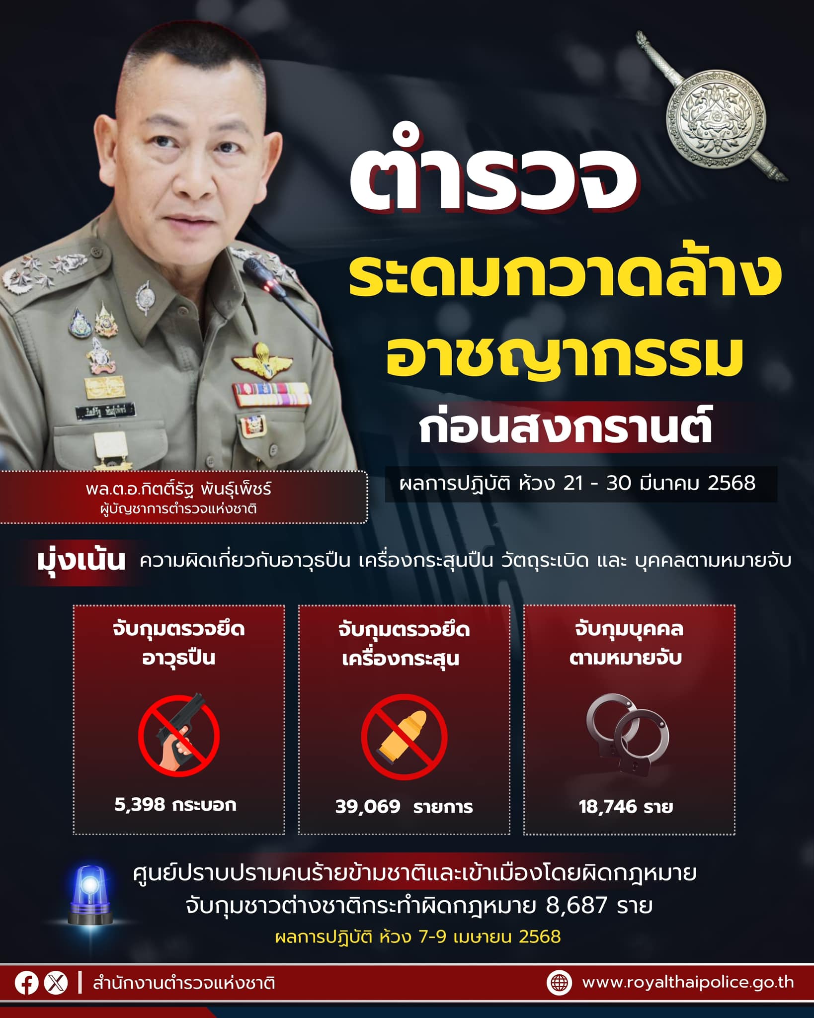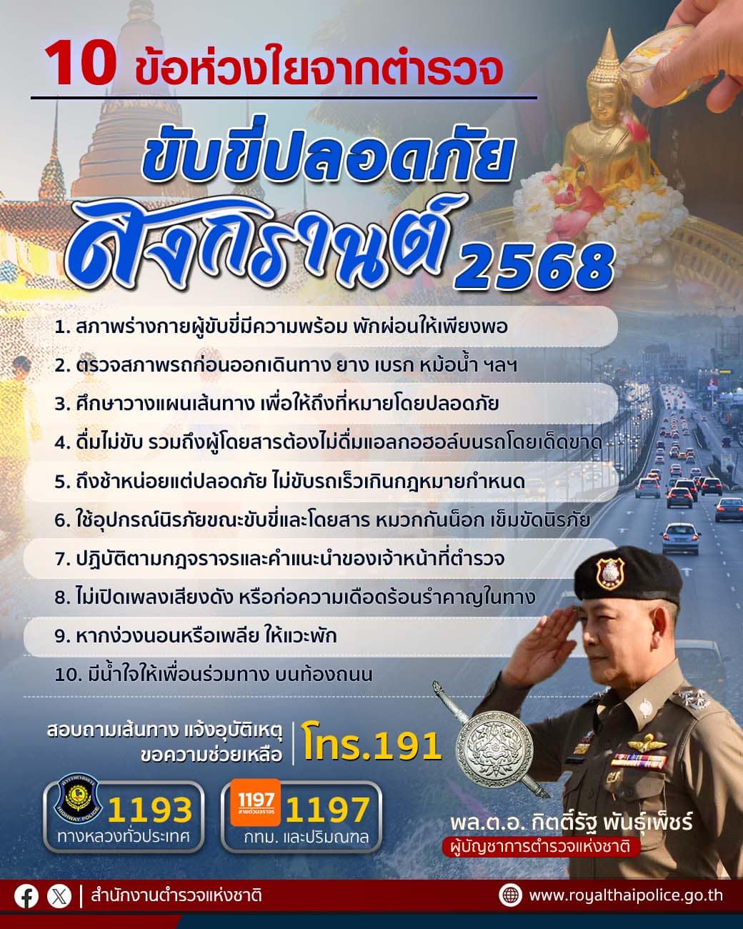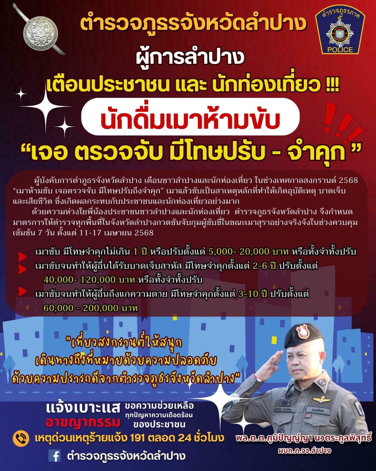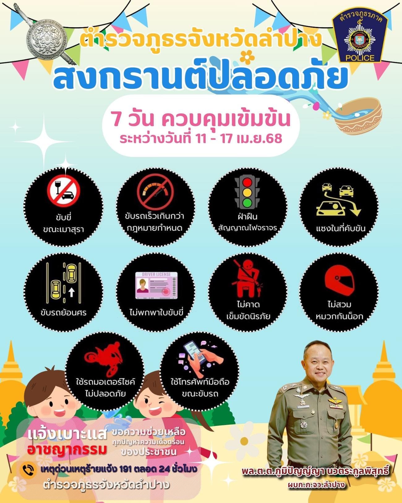 ผบช.ภ.5 สั่งเข้มทุกหน่วยในสังกัด จับจริง ปรับจริง 10 ข้อหาหลัก รณรงค์ “เมาไม่ขับ ง่วงไม่ขับ”เน้นย้ำขับขี่รถจักรยานยนต์ต้องสวมหมวกนิรภัย เพื่อการขับขี่ที่ปลอดภัยช่วงเทศกาลสงกรานต์ ประจำปี 2568 14 เมษายน 2568 พล.ต.ท.กฤตธาพล ยี่สาคร ผบช.ภ.5 สั่งการทุกหน่วยในสังกัด ยกระดับการปฏิบัติหน้าที่ให้สูงขึ้น ทั้งด้านการป้องกันและปราบปรามอาชญากรรม ดูแลความปลอดภัยของประชาชนและนักท่องเที่ยว โดยเฉพาะอย่างยิ่งบริเวณจุดจัดงานเทศกาลสงกรานต์ขนาดใหญ่ สถานีขนส่ง และจุดบริการต่างๆ ดูแลอำนวยความสะดวกด้านการจราจรให้กับประชาชน เดินทางด้วยความปลอดภัย พร้อมบังคับใช้กฎหมายจราจร 10 ข้อหาหลักอย่างเข้มงวด โดยเน้นหนักในขับรถในขณะเมาสุรา ขับรถเร็วเกินที่กฎหมายกำหนด ไม่สวมหมวกนิรภัย โดยให้ดำเนินการจับจริง ปรับจริง และกวดขันจับกุมอาชญากรรม อาวุธปืน ยาเสพติด และสิ่งผิดกฎหมายต่างๆ เพื่อให้เกิดความปลอดภัยแก่ประชาชน และประชาสัมพันธ์ให้ประชาชนที่ไม่ได้อยู่บ้าน เข้าร่วม “โครงการร่วมใจ ยกระดับความปลอดภัยบ้านประชาชนช่วงเทศกาลสำคัญ (ฝากบ้าน 4.0)” เพื่อให้เจ้าหน้าที่ได้เข้าไปช่วยสอดส่องดูแลความปลอดภัยในทรัพย์สินในช่วงเทศกาลสงกรานต์ประจำปี 2568 ทั้งนี้ให้เจ้าหน้าที่ตำรวจทุกหน่วยในสังกัดพร้อมปฏิบัติหน้าที่อย่างเต็มที่ เพื่อดูแลความปลอดภัยในชีวิตและทรัพย์สิน อำนวยความสะดวกให้กับพี่น้องประชาชน ขอให้ประชาชนมั่นใจ เดินทางกลับภูมิลำเนาและท่องเที่ยวอย่างมีความสุขในช่วงเทศกาลสงกรานต์ หากพบเห็นหรือมีเบาะแสเกี่ยวกับการกระทำความผิด หรือสิ่งของผิดกฎหมายในพื้นที่ หรือในโซเชียลมีเดีย โปรดแจ้งสายด่วน 191 หรือ line@police5 ได้ตลอดเวลา 24 ชั่วโมง