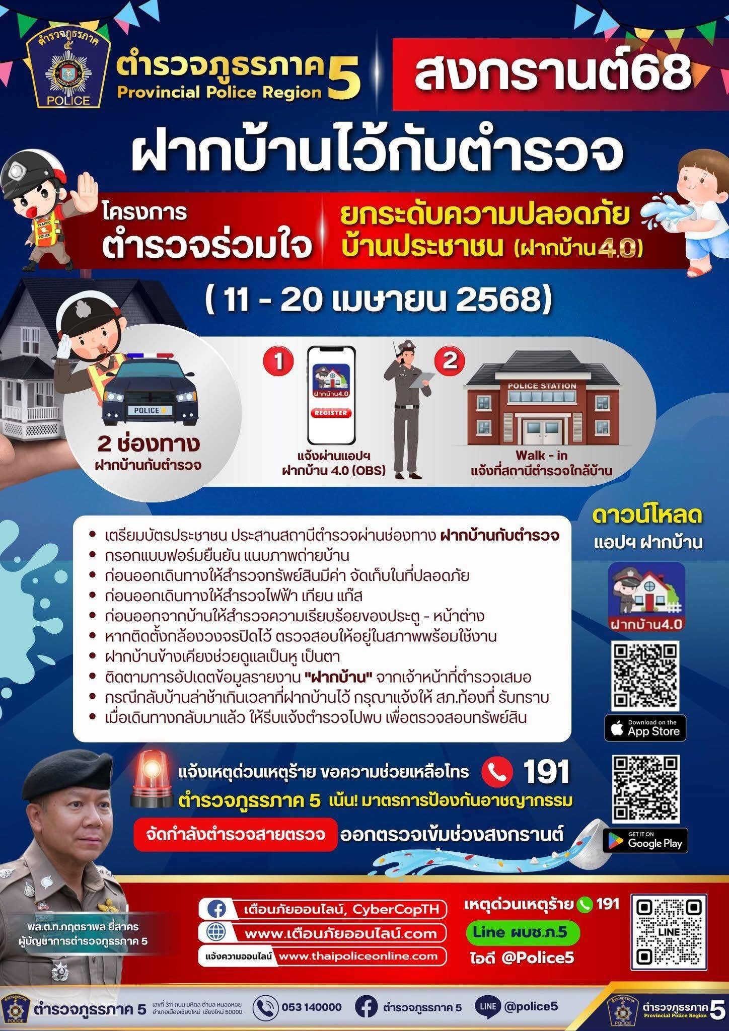 แจ้งประชาสัมพันธ์พี่น้องประชาชนทุกท่านโครงการฯ ฝากบ้านไว้กับตำรวจ ช่วงสงกรานต์ 68ตั้งแต่วันที่ 11-20 เมษายน 2568ผ่านทางแอปฯ “ฝากบ้าน 4.0 (OBS)” และ Walk – in สถานีตำรวจใกล้บ้านท่าน