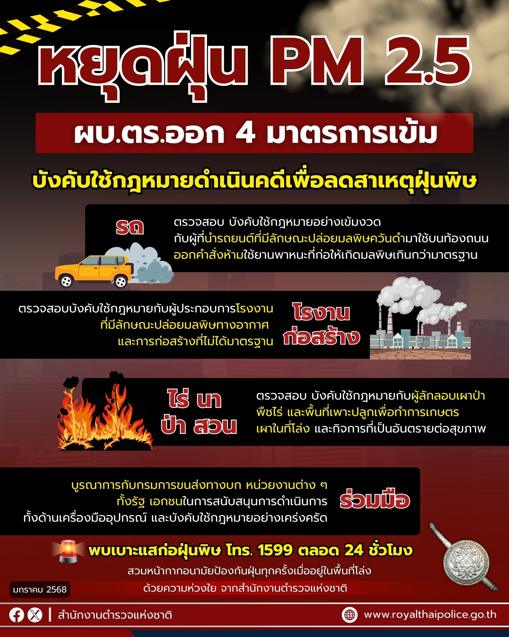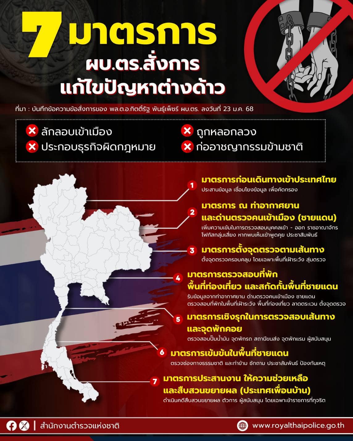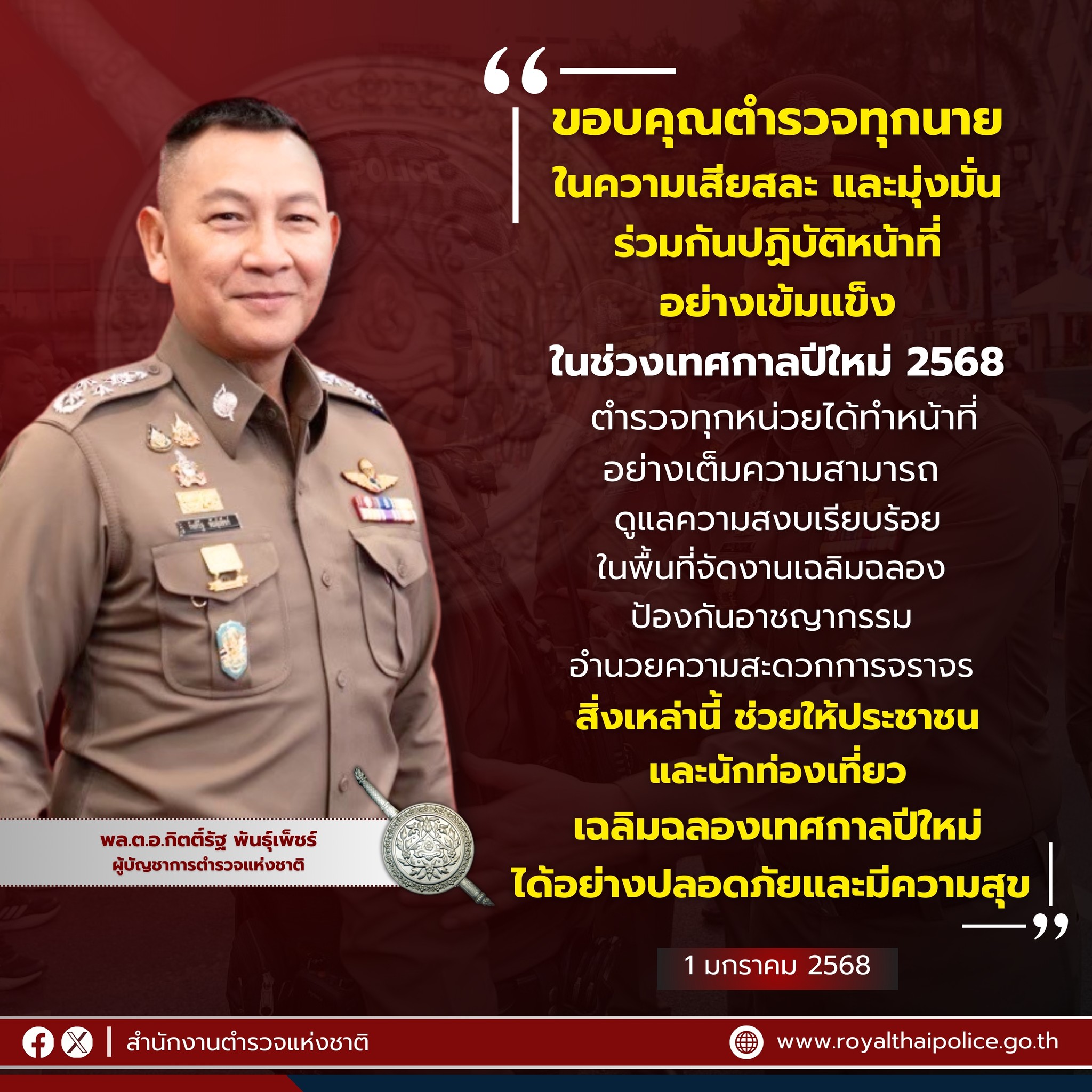 สำนักงานตำรวจแห่งชาติมีมาตรการเข้ม ดูแลประชาชนช่วงเทศกาล #ตรุษจีน 2568 ทั้งวันจ่าย วันไหว้ วันเที่ยว แนะระมัดระวังภัย . เมื่อวันที่ 26 มกราคม พ.ต.อ.วรศักดิ์ พิสิษฐบรรณกร รองผู้บังคับการสายตรวจและปฏิบัติการพิเศษ รักษาราชการแทนผู้บังคับการกองสารนิเทศ (รอง ผบก.สปพ.รรท.ผบก.สท.) เปิดเผยว่า ช่วงวันที่ 27-29 มกราคม 2568 เป็นเทศกาลตรุษจีนประจำปี 2568 โดยพี่น้องชาวไทยเชื้อสายจีนจะออกมาจับจ่ายซื้อของ เพื่อทำพิธีไหว้บรรพบุรุษ รวมทั้งเดินทางกลับภูมิลำเนาและท่องเที่ยวเฉลิมฉลองเป็นจำนวนมาก ดังนั้น เพื่อให้การป้องกันปราบปรามอาชญากรรม ดูแลความปลอดภัยในชีวิตและทรัพย์สินของประชาชน เป็นไปด้วยความเรียบร้อยและมีประสิทธิภาพตลอดห้วงเทศกาลตรุษจีน ทั้งวันจ่าย วันไหว้ วันเที่ยว สำนักงานตำรวจแห่งชาติ โดย พล.ต.อ.ประจวบ วงศ์สุข รองผู้บัญชาการตำรวจแห่งชาติ จึงกำชับให้หน่วยปฏิบัติดำเนินการตามมาตรการป้องกันปราบปรามอย่างเคร่งครัด . พล.ต.อ.ประจวบฯ สั่งการไปยังกองบัญชาการตำรวจนครบาล , ตำรวจภูธรภาค 1 – 9, กองบัญชาการตำรวจสอบสวนกลาง , กองบัญชาการตำรวจปราบปรามยาเสพติด , กองบัญชาการตำรวจท่องเที่ยว เพิ่มความเข้มงวด โดยเน้นการจัดเจ้าหน้าที่ตำรวจออกตรวจบริเวณที่มีประชาชนเดินทางไปจับจ่ายใช้สอยสินค้าที่นำไปประกอบพิธีไหว้บรรพบุรุษ รวมทั้งเฝ้าระวังการป้องกันเหตุประทุษร้ายต่อทรัพย์ ธนาคาร ร้านทอง ร้านอัญมณี ร้านสะดวกซื้อ โรงทาน รวมทั้งเฝ้าระวังการเกิดเหตุเพลิงไหม้ เตรียมพร้อมรับสถานการณ์ตามแผนเผชิญเหตุ และเน้นให้เจ้าหน้าที่ตำรวจออกตรวจตามสถานที่ท่องเที่ยว โรงแรม หรือในย่านที่เป็นที่พักอาศัยของคนไทยเชื้อสายจีนที่เดินทางไปท่องเที่ยว รวมทั้งป้องกันการโจรกรรมรถยนต์และรถจักรยานยนต์ หรือการลักทรัพย์ในเคหะสถาน . พร้อมกันนี้สั่งการให้สำนักงานตรวจคนเข้าเมืองเพิ่มความเข้มงวดในการตรวจสอบเอกสารการเดินทาง ผ่านเข้า-ออกราชอาณาจักร, ให้กองบัญชาการตำรวจปราบปรามยาเสพติดเพิ่มความเข้มงวดในการกวาดล้างจับกุมผู้ค้ายาเสพติด และขบวนการลำเลียงยาเสพติดที่ฉวยโอกาสในห้วงเวลาดังกล่าว ลักลอบลำเลียงยาเสพติดเข้ามาตามแนวชายแดนเข้าสู่พื้นที่ตอนในของประเทศ เพื่อส่งต่อไปยังลูกค้ารายย่อยตามภูมิภาคต่าง ๆ หรือลักลอบลำเลียงส่งผ่านต่อไปยังประเทศที่สามและผู้ค้ารายย่อย อย่างต่อเนื่องจริงจัง โดยให้กองบัญชาการตำรวจตระเวนชายแดนร่วมปฏิบัติ รวมทั้งให้กองบัญชาการตำรวจสืบสวนสอบสวนอาชญากรรมทางเทคโนโลยี ดำเนินการป้องกันปราบปรามการกระทำความผิดอาชญา