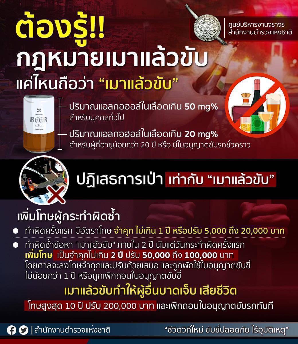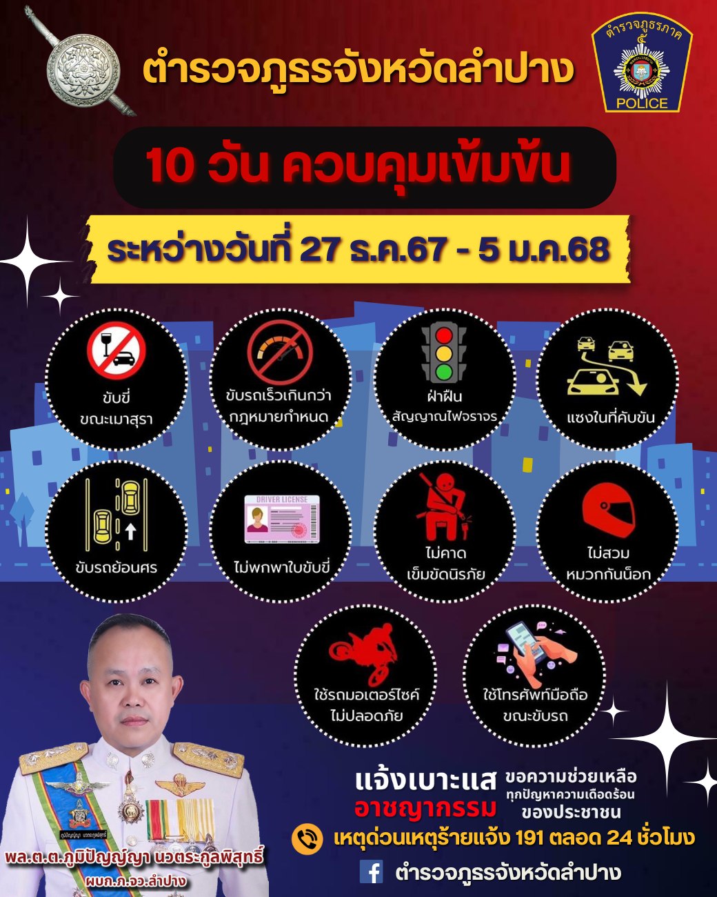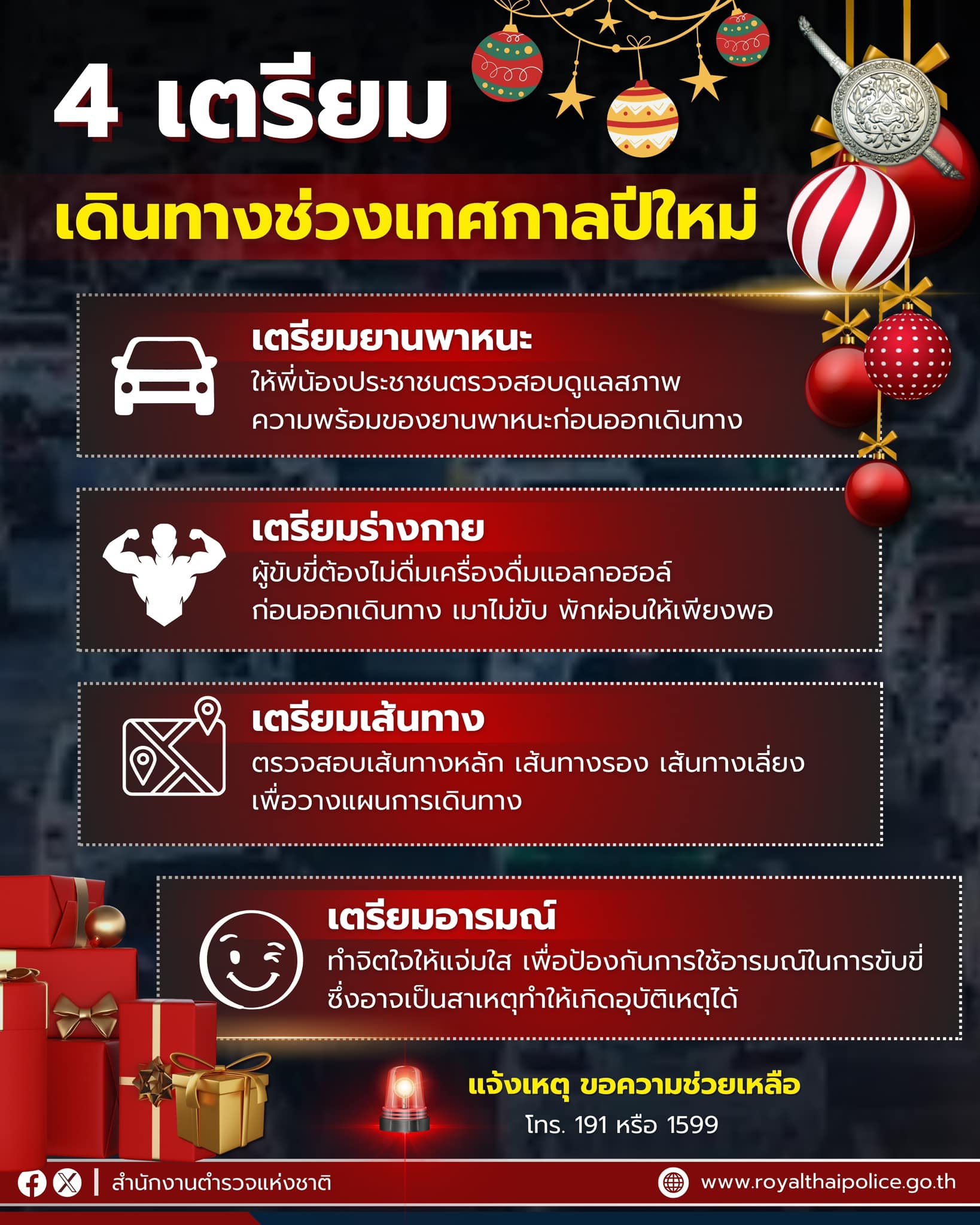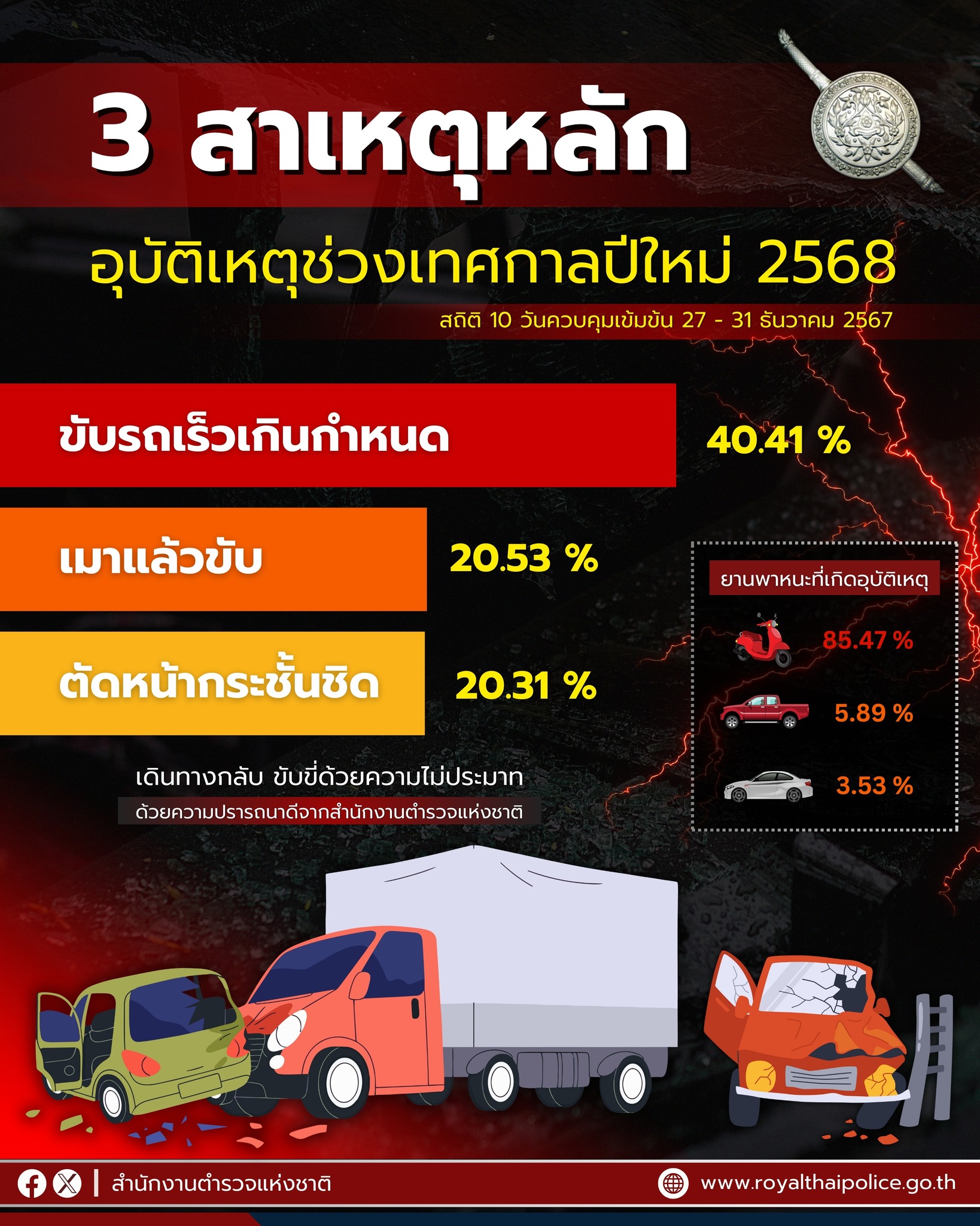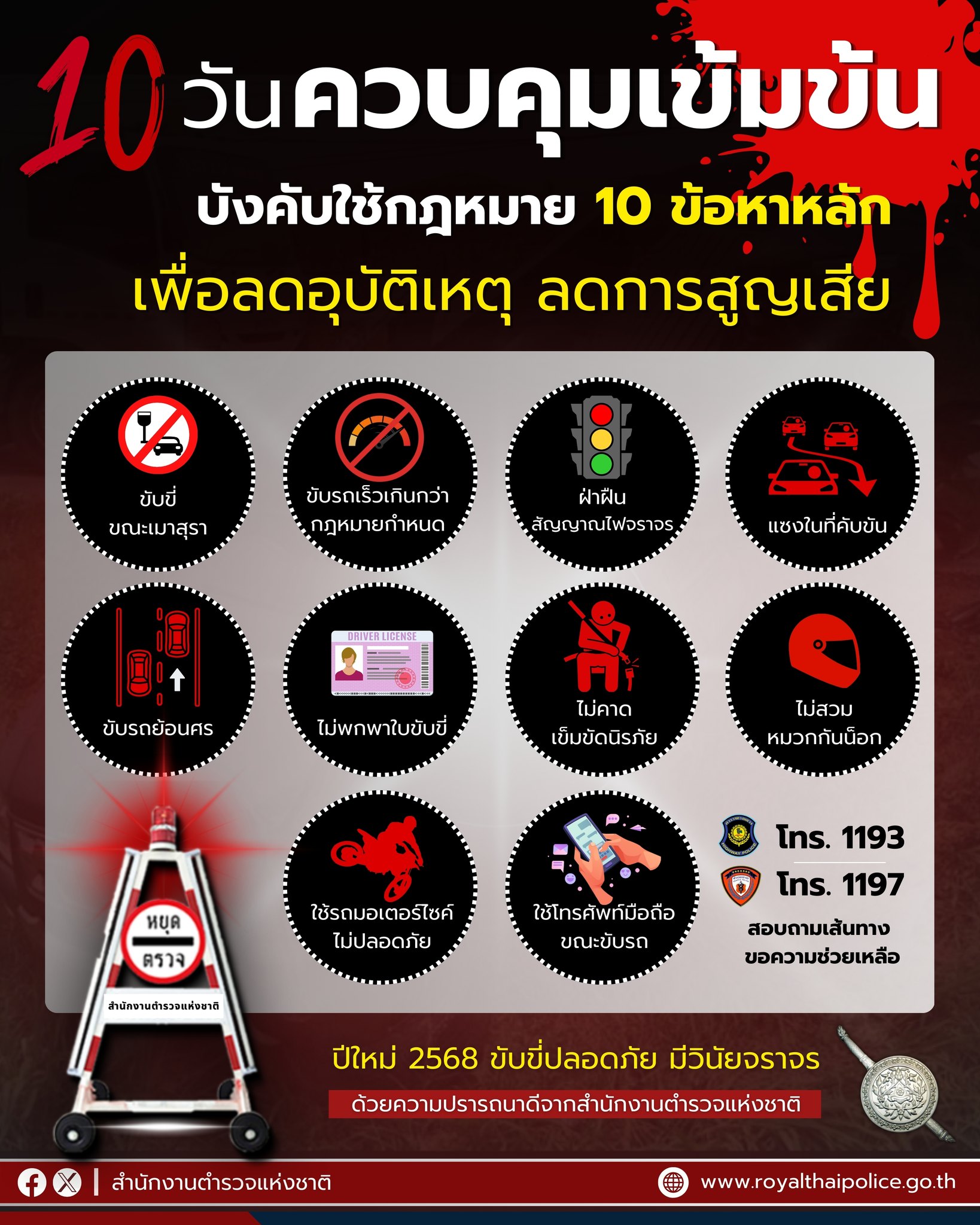 เดินทางกลับ ขับขี่ด้วยความไม่ประมาท เพื่อความปลอดภัยของท่าน และเพื่อนร่วมทาง ช่วง 10 วันควบคุมเข้มข้น เกิดอุบัติเหตุบนท้องถนนต่อเนื่อง พบว่า 3 สาเหตุหลักของอุบัติเหตุ คือ 1. ขับรถเร็ว 2. เมาแล้วขับ 3. ตัดหน้ากระชั้นชิด เดินทางปลอดภัย มีวินัยจราจร ด้วยความปรารถนาดีจากสำนักงานตำรวจแห่งชาติ