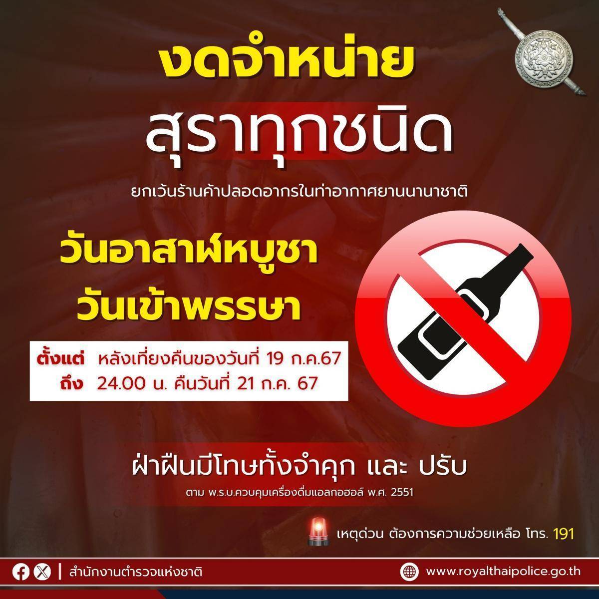 สำนักงานตำรวจแห่งชาติเตือนห้ามขายเครื่องดื่มแอลกอฮอล์ทุกชนิด เนื่องในวันสำคัญทางศาสนา “วันวิสาขบูชา” 22 พฤษภาคมนี้ กำชับตำรวจทั่วประเทศตรวจตราเข้มงวด . เมื่ิอวันที่ 21 พฤษภาคม 2567 พล.ต.ต.หญิง สมพร พูลเกษม ผู้บังคับการกองสารนิเทศ เปิดเผยว่า ด้วยวันที่ 22 พฤษภาคม 2567 เป็น “วันวิสาขบูชา” และมีประกาศสำนักนายกรัฐมนตรี เรื่อง กำหนดวันห้ามขายเครื่องดื่มแอลกอฮอล์ (ฉบับที่ 3) พ.ศ.2558 ห้ามมิให้ผู้ใดขายเครื่องดื่มแอลกอฮอล์ในวันมาฆบูชา วันวิสาขบูชา วันอาสาฬบูชา วันเข้าพรรษา และวันออกพรรษา ยกเว้นเฉพาะร้านค้าปลอดอากรภายในอาคารท่าอากาศยานนานาชาติ โดยมีกระทรวงสาธารณสุขเป็นหน่วยรับผิดชอบควบคุม กำกับ ดูแล ตามพระราชบัญญัติควบคุมเครื่องดื่มแอลกอฮอล์ พ.ศ.2551 . วันวิสาขบูชาปีนี้ พล.ต.อ.กิตติ์รัฐ พันธุ์เพ็ชร์ รองผู้บัญชาการตำรวจแห่งชาติ รักษาราชการแทนผู้บัญชาการตำรวจแห่งชาติ (รอง ผบ.ตร.รรท.ผบ.ตร.) สั่งการหน่วยต่างๆ ทั่วประเทศ เพื่อให้การบังคับใช้กฎหมายในวันสำคัญทางศาสนาเป็นไปด้วยความเรียบร้อย มีประสิทธิภาพ . “ได้กำชับให้สถานีตำรวจทุกแห่งประชาสัมพันธ์แจ้งเตือนผู้ประกอบการ ร้านค้าทุกประเภท ทั้งร้านค้าในชุมชน ร้านสะดวกซื้อ ห้างสรรพสินค้า ร้านอาหารที่ขายเครื่องดื่มแอลกอฮอล์ รวมถึงสถานบริการและสถานประกอบการที่เปิดให้บริการลักษณะที่คล้ายสถานบริการ ให้งดขายเครื่องดื่มแอลกอฮอล์ทุกชนิด ทั้งชนิดขายส่งและขายปลีกทั่วราชอาณาจักร ตลอด 24 ชั่วโมง ระหว่างเวลา 00.01 – 24.00 น. ของวันที่ 22 พฤษภาคม 2567 ยกเว้นเฉพาะร้านค้าปลอดอากรภายในอาคารท่าอากาศยานนานาชาติ หากผู้ใดฝ่าฝืน มีความผิดตามพระราชบัญญัติควบคุมเครื่องดื่มแอลกอฮอล์ พ.ศ.2551 มาตรา 39 ต้องระวางโทษจำคุกไม่เกิน 6 เดือน หรือปรับไม่เกิน10,000 บาท หรือทั้งจำทั้งปรับ” . นอกจากนี้ พล.ต.อ.กิตติ์รัฐฯ กำชับให้เจ้าหน้าที่ตำรวจทั่วประเทศกวดขันจับกุมผู้กระทำความผิดที่ฝ่าฝืนกฎหมายและประกาศสำนักนายกรัฐมนตรี เช่น การขาย การดื่มในสถานที่ห้าม และการขายให้แก่บุคคลที่ห้ามขาย โดยให้เน้นการตรวจตราร้านข้ามต้มโต้รุ่ง คาราโอเกะ ร้านอาหารตามสั่งริมทาง บริเวณสถานีขนส่ง สถานีรถไฟ สถานีบริการน้ำมันเชื้อเพลิง วัด