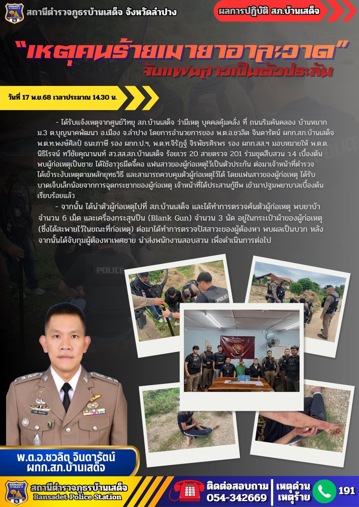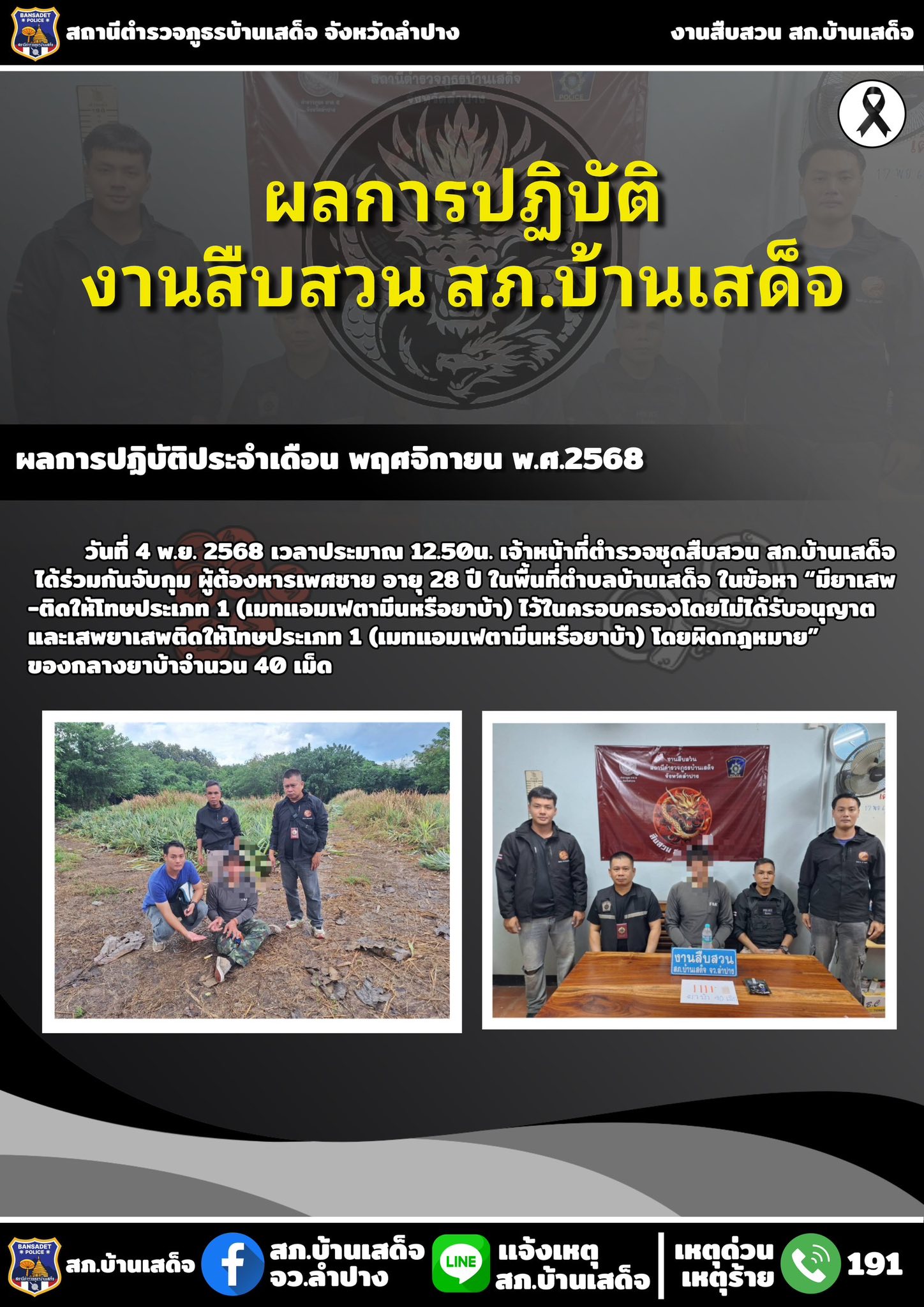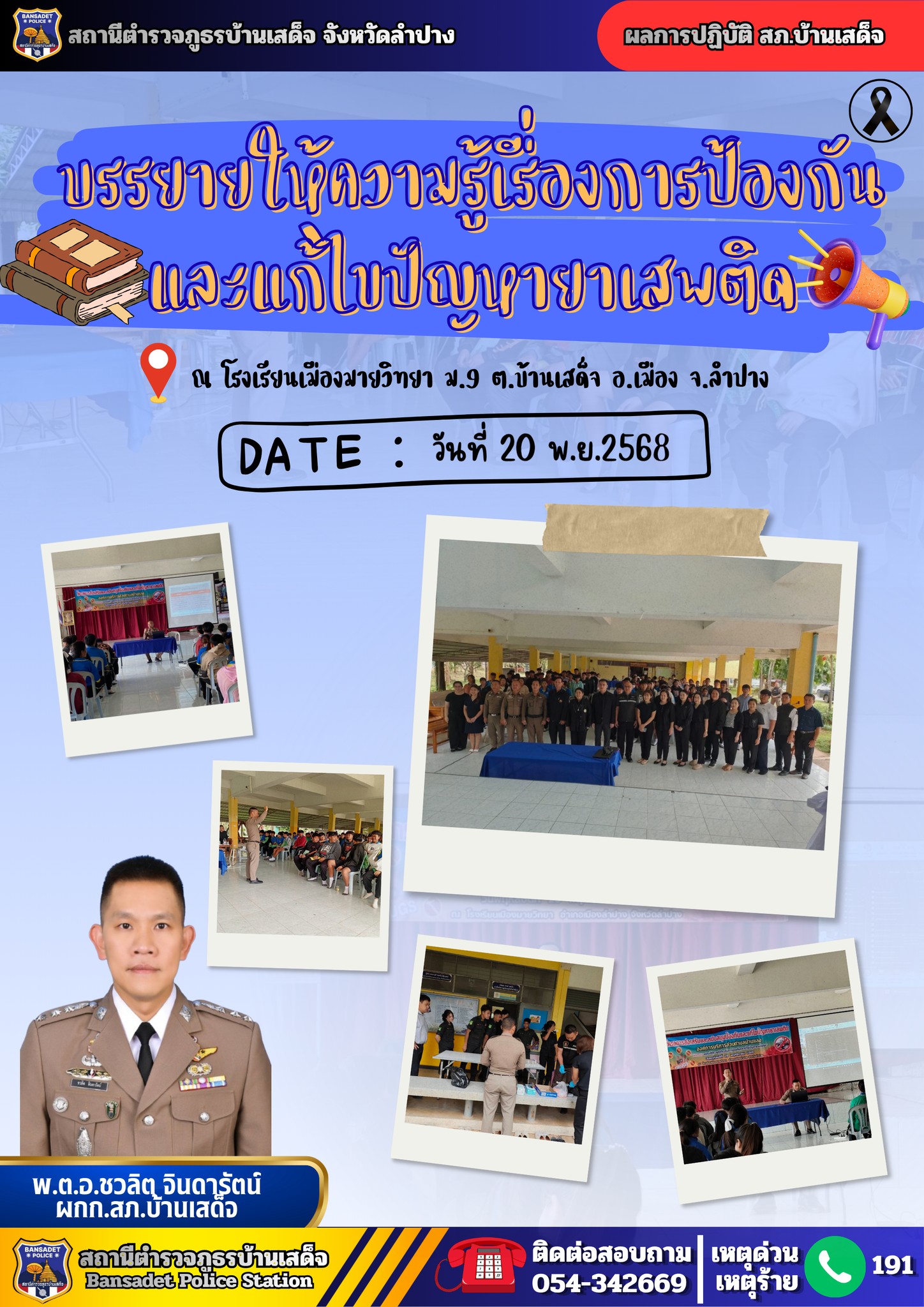 สภ.บ้านเสด็จ จว.ลำปาง วันที่ 20 พฤศจิกายน 2568 เวลา 08.30 น. โดยการสั่งการของ พ.ต.อ.ชวลิต จินดารัตน์ผกก.สภ.บ้านเสด็จ , พ.ต.ท.พงษ์ศิลป์ ธนะภาษี รอง ผกก.ป.ฯ, พ.ต.ท.กำจร ใจจันทร์ สวป.ฯ สั่งการให้ ร.ต.อ.พิชิตชัย ไชยาโส รอง สวป.สภ.บ้านเสด็จ ร้อยเวร 20 ด.ต.อากาศ ทองแสน ผบ.หมู่(ป.)ฯ พร้อมสายตรวจ 201 ว.4 บรรยายให้ความรู้เรื่องการป้องกันและแก้ไขปัญหายาเสพติดและ Re X-ray ตรวจหาสารเสพติดครูนักเรียนบุคลากรณ ณ โรงเรียนเมืองมายวิทยา ม.9 ต.บ้านแลง อ.เมือง จ.ลำปาง