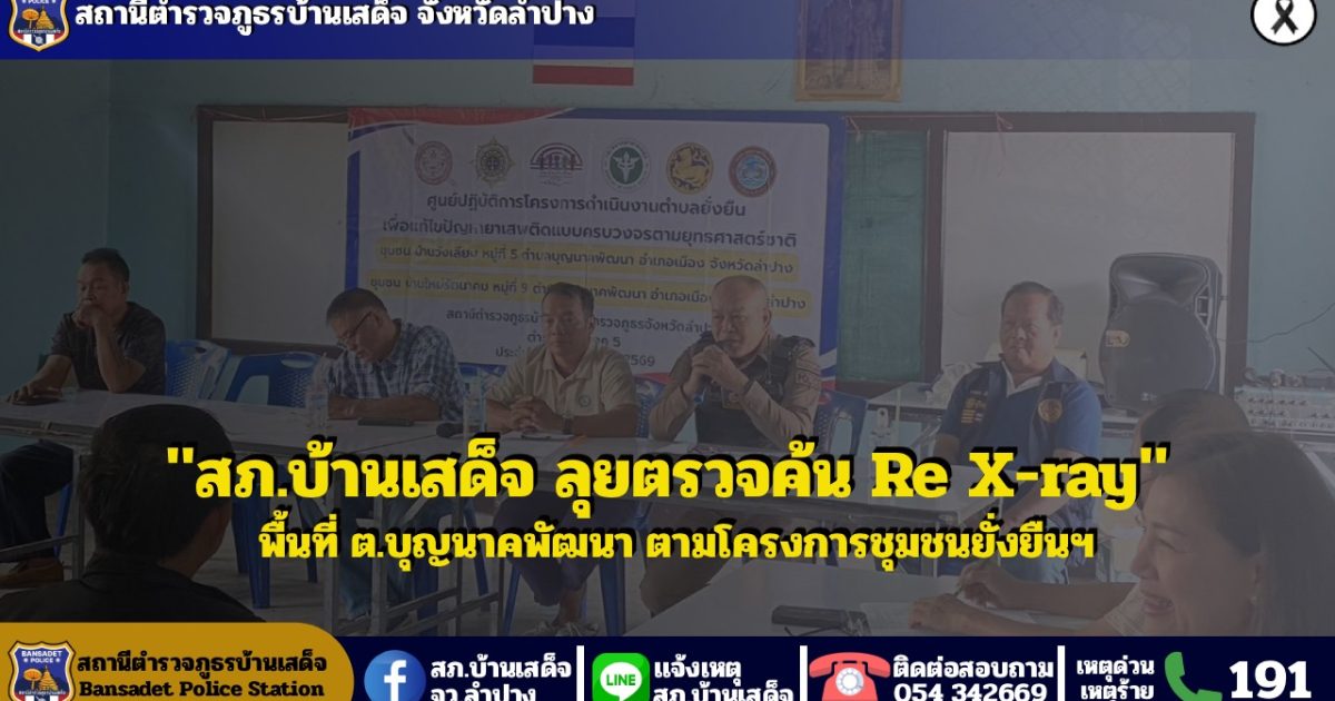 วันที่ 8 มี.ค.69 เวลา 09.00 น. โดยการอำนวยการของ พ.ต.อ.ชวลิตจินดารัตน์ ผกก.สภ.บ้านเสด็จ พ.ต.ท.พงษ์ศิลป์ ธนะภาษี รอง ผกก.ป.ฯ, พ.ต.ต.นพ พึ่งศรี สวป.ฯ มอบหมายให้ ร.ต.ท.วิรัช วงค์บุตร ร้อยเวร 20 และเจ้าหน้าที่ชุดปฏิบัติการตำบลยั่งยืน สภ.บ้านเสด็จ ดำเนินการ Re X-ray ค้นหาผู้เสพ ณ บ้านวังเลียบ ม.5 และบ้านใหม่รัตนาคม ม.9 ต.บุญนาคพัฒนา อ.เมือง จ.ลำปาง